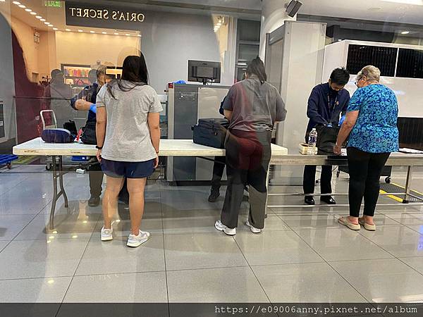 因為人龍轉一個彎進去一個候機室需要再過一次行李安檢,當我們排了3分鐘,發現安檢速度超慢…原來是人工打開乘客的包包檢查,不管是大包還是小包的東西,連書本用品衣物都被拿出來,而不是過X光機器,是人工一個一個檢查,我們覺得實在太奇怪了